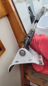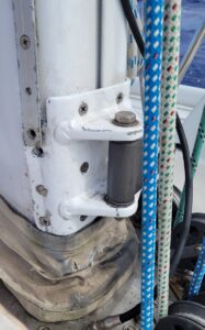 Day 16: Boom Vang Plate Screw Lose. On our deck walk, we found a screw from the plate that attaches the hydraulic boom vang to the mast (a vang is needed to keep the boom from rising when sailing off the wind, and also to hold boom up when the main sail is down). We replaced the screw, inspected and tightened the remaining screws, and continued to check daily.