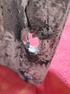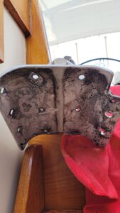 Day 36: Catastrophic loss of vang plate. As screws come out and sheer off, the vang plate torques its way off the mast. We manage to remove the hydraulic vang and plate completely, then remove the plate which was sheered off of the mast and bent in the process. Harley uses a hammer (a la “Thor”) to bend the plate back enough to remount and attach with larger bolts, found after rummaging through Kailani’s extensive spare bolt collection. We remount the vang to boom and mast and run with it. Needless to say, our riggers in Annapolis are on our call list since this and the chafed halyard are related to their work.