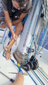 So as we inched it down bit by bit, we would take breaks and tie off some of the sail forward to limit the amount flying about. We finally got it down far enough that I could sit on the deck, leaning against one of the dorade granny posts for security, and with my arms outstretched as far up as possible, could hold the head shackle of the sail. Then Harley undid the halyard shackle, but just at the moment the boat lurched and he lost hold of the halyard. Now the halyard, with the roll of the boat, started to wrap itself around everything in its swing radius: shrouds, other halyards, the mast. We were screwed. We had to get the halyard either up all the way or down all the way, otherwise we could not use either of our headsails. Harley climbed the mast with the boat hook to try to catch it and redirect where it wrapped, and eventually we got it twisted up just between two spare halyards that were attached at the deck.