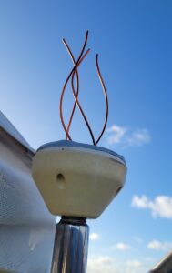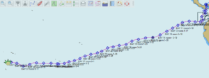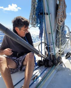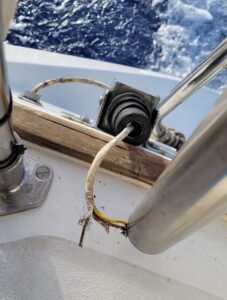 Day 37: Rogue Wave. We were on port tack at about midnight on my watch sailing in squally weather and confused seas, some following seas of 14 feet and winds up to 27 knots. I was adjusting the main sheet when I heard the very distinct sound of what can only be described as an oncoming freight train. But I knew what it was – a rogue wave. I immediately dove as far forward and low into the cockpit as I could, the wave hit and broke from the port side, putting us on our “ear” with the boom in the water, the cockpit flooded. Besides resembling a drowned rat, I was otherwise generally unscathed. (Miraculously, somehow Harley did not even wake, a testament to the exhaustion levels we were running with). Once we righted, my first concern was our vang plate, given the strain put on it with the boom being dragged in the water. All checked out okay. It was not until dawn that we discovered that the rogue wave had actually caused the wind generator pole to dismount vertically off its mount, loosening two of the bars that stabilize it vertically. It severed its wiring and knocked out our Iridium Go antenna. For an hour Harley and I worked to secure the dismounted pole as best we could by tying lots of securing lines, and assemble what was left of the Go antenna. Needless to say, another repair that can only be effected once we are at anchor.