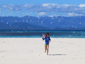 Fiji was a lot of fun although we had to spend a long time waiting for a part for the boat in a place called Vanua Balavu. We met a lot of cruisers there and made some new friends in the villages. Later on in the season Dad got a bad infection in his leg so we left Fiji and Mom sailed us the 750 miles to New Caledonia to get medical attention. Along the way she had to give Dad a shot every day in his backside. It hurt a lot but I held his hand and gave him a jelly bean afterward. Just before we left we found two banded coral sea snakes on the boat. One came crawling out of my cabin, and I thought Mom was going to cry. Supposedly they have a very deadly bite, but luckily we got them off the boat without being bitten. New Caledonia was different mostly because I had to learn some French since everyone speaks it there. They have really great bakeries so we ate a lot of croissants and there was a huge fish market that made up for Dad’s inability to catch any.