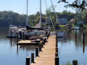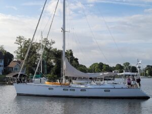 And as we have oft found, with every cloud there is that silver lining. All of these protracted delays meant we needed to get out of the marina, being creatures of life “on the hook” as opposed to tied to land. The trick was not wandering too far to anchor out so that Kailani could still be available at a moment’s notice when a vendor called with the seemingly elusive promise of progress. We threw off the dock-lines and motored all of 1.5 nm to a small but beautiful inlet called Almshouse Creek. We had barely set the hook when we were greeted by Cindy and Westbrook Murphy. And what an absolute TREAT they are! As port officers for our cruising club OCC, they were spectacularly graceful and friendly, and in fact they were the highlight of our cruising season of 2021. Issues with Kailani (generator related-again “parts delayed”) evolved to the point that we were needing to up anchor each morning, motor about the Chesapeake Bay for a couple hours to charge our batteries, and then come back and anchor. Inquiring about this somewhat “crazy” behavior, Westbrook offered the solution of allowing us to side-tie alongside their dock. And so began our daily opportunity to get to know the Murphy’s, whose generosity really had no bounds.
