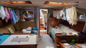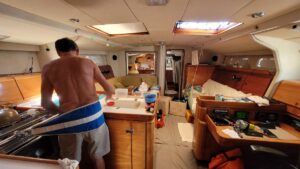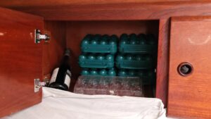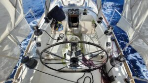 Otherwise, each day we do our respective chores. There is the “gardening”, my term for checking on our stores to prevent spoilage and making sure the day’s vittles are accessible, which means “shopping” from the various stowage spots throughout Kailani to resupply items as the pantry gets low. Each day the eggs must be rotated, and the cabbage, potatoes, and onions inspected and adjusted to keep from spoiling. Items in the fridge also have to be inspected since once rot sets in everything starts to go. We bake bread, make yogurt, make beans, maintain the charge on the batteries, insure the fridge and freezer stay at the proper temperature and run the water maker to keep our fresh water tank full. Then there is the usual cleaning up of the galley, the heads, daily rinsing of the cockpit, and sweeping up floors down below. And let’s not forget the daily deck walk to check for chafe, gear mishaps and removal of the night’s roadkill.