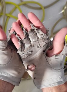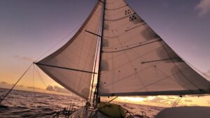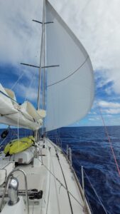 So the priorities are: sail the boat, sleep when you can, eat when you can. There have been days out here when we have done 10 sail changes in a day, sometimes spending 4-5 hours changing our set up. After each of these sail plan changes our cockpit reminds me of photos I have seen of an ER room “post trauma” – the carnage in this case being all of our various lines and sail sheets strung out around winches and on the cockpit sole. And I think it may be time to finally retire my old sailing gloves. I am trying to decide if they should be buried at sea or hung on a wall, since they have been with me for 20 years of sailing, over 50,000 miles. Since reaching the “trade winds” the sailing has been the most fickle, at times with us running solely with our Code Zero (light air sail), dropping the main sail completely. We cannot remember a passage EVER, where we have completely taken down the main sail so many times – at least six so far. To offset this light air sailing we have been poled out wing-and-wing, double reefed, and have hove-to twice so far. It has been strange.