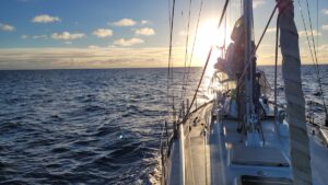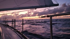 But in spite of all this our life goes on. People often ask – “don’t you get sick of each other? Don’t you go stir crazy?” Well, no, we actually hardly spend any time “together” due to the watch schedule (and by the way, we enjoy spending time together :)). We typically only share tea together in the morning and lunch at midday. In terms of stir crazy, well, not really. There is a lot more to do out here than one may imagine, starting with just sailing the boat, maintaining her systems, and changing sail plans and navigation in accordance with weather. As a crew of two, we also prioritize sleep when we can.