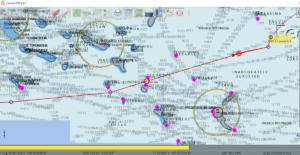 The nearly 4,900 nm in our wake since leaving Panama plus the remaining 1,800 nm we have yet to cover will definitely make this the longest passage we have ever made. Rather than enjoying the traditional trade wind sailing the weather has been unusual to say the least. This has forced us to bob and weave as we cut through the Tuamotu which is a bit of a navigational nightmare since there are literally hundreds of motus, atolls, and reefs to avoid. (See screenshot below, pink highlights land hazards marked so we can see them when we zoom out on the electronic chart). And the charts, while up to date, still carry notations of offsets of up to a mile and in some places confess to being “Inadequately Surveyed”. The light air is also backing and making courses difficult to maintain, and our speeds have been so atypically slow, we console ourselves by saying “well, this would be have been a good day on Manu Kai” (our first boat, for which 6 kts would have been fast).