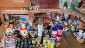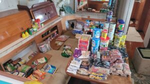 Not an exhaustive list, but a pretty good percentage of the tonnage we have bought, shuttled aboard, decanted, and stowed. Inventory lists tell us where everything is since it all gets stuffed into lazarettes, closets, bilges and bunks. We have a fairly large freezer and fridge (although small by land standards) and keeping all of our fresh foods from spoiling is an art in and of itself, one which we’ve continually improved throughout our years of sailing.