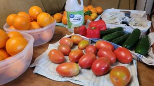 • 4 lbs tomatoes, 5 lbs potatoes, 6 cucumbers, 6 onions, 6 cabbages, garlic, ginger