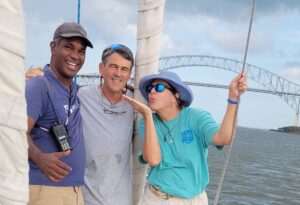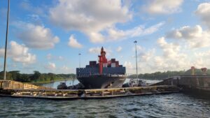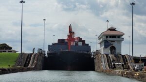 For most of our transit of the lake, we had a “New Panamax” container ship just off our port quarter (1,200 feet long and as tall as a small skyscraper, they are the largest ships that transit taking up the entire length of the lock chamber). At one point this ship sped up and was passing us on port, while another ship passed in the other direction – our advisor wanted us to keep pace with the Panamax because if we did not, his prop wash and wake would push us into the land on our starboard. As we did so, an additional tug came along and lined up perpendicular to the Panamax ship and directly on our bow. Our advisor told us to keep going, then he ran up on the bow yelling and radioing that tug to get out of the way. Orchestrated chaos.