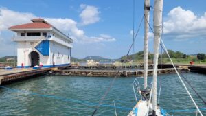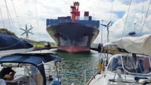 Going through the Canal is quite an experience with the Canal itself a marvel of civil engineering. Completed by the United States in 1914 (who took it over from the French who had tried to dig a sea level canal through the isthmus) it remains basically unchanged to this day. The “donkey” engines which assist the big ships through are no longer steam powered but they run on the original tracks. For us small sail and power boats, though, the manner in which we go through the locks is unchanged. In each lock the prop wash from ships and the rapidly changing water levels as the lock fills or empties 30 feet at a time makes staying in the center of the lock difficult but essential to mitigate the risk of smashing into one of the canal walls.