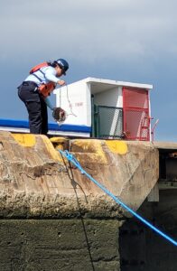 These monkey fists are hard round balls of line and randomly land on the boat – the sailboat next to us had padding on their solar panels as sometimes the monkey fist can land and crack those. Our line handlers then grab the monkey fist and tie its line to one of the 100′ floating 1” blue lines (that we have to rent) – two on the bow, and two on the stern. Then the on-land handlers retrieve our lines by pulling their lead line back, finally tying off the blue lines to the bollards atop the canal. When we are all secured, the advisor whistles again indicating we are ready. Alarms sound ashore, the locks close, water fills or empties, and our on board line handlers constantly keep the lines taught on the bow and stern by easing or trimming, keeping the boats centered and off the lock walls.