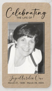 Mom passed on Good Friday, and we organized a memorial service for her for nine days later on a Sunday afternoon, at the same church where we had our Dad’s service 15 years ago. It was a truly beautiful celebration of life, with friends and family coming in from around the states to pay respect and support us. We had four days of gatherings as people trickled into town and stayed past the service. Once again, seeing family and friends after so many years in between the last visits was a blessing. People all shared their stories of memories of our mom and coming together to pay tribute to her was a remarkable time. Jeff and Jason each gave fantastic eulogies, while I tried to keep my emotional self out of the limelight and stick to organizing a photo montage of her life to display during the service and reception. After my brothers’ extremely touching eulogies my reading of Psalm 23 was very difficult, tears came, and I barely made it through. Ahh Mom, Joyce Aurelia Oen (nee Malgieri), we will miss you.
